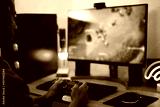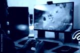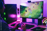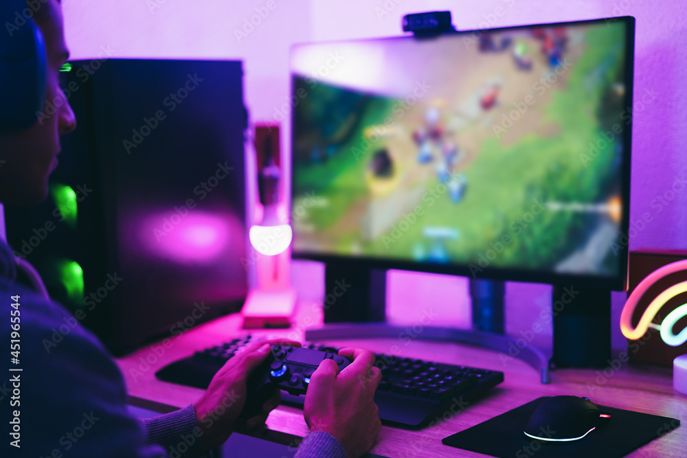 Girl gamer playing strategy game online using virtual reality headset - Soft focus on right hand