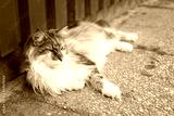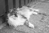 A closeup shot of a cute cat laying down on the ground