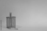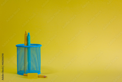 Basket with two yellow and blue pencils over yellow background. Back to school
