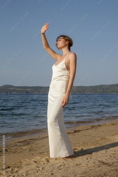 Outdoor portrait of woman in white long silk camisole dress. Summer wedding season fashion.