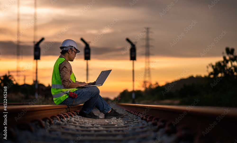 Engineer under inspection and checking construction process railway switch and checking work on railroad station .Engineer wearing safety uniform and safety helmet in work.