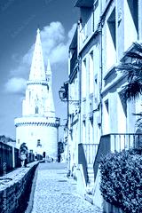 Vertical view of the Lantern Tower and Sur-Les-Murs medieval street in La Rochelle France