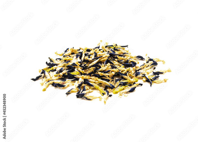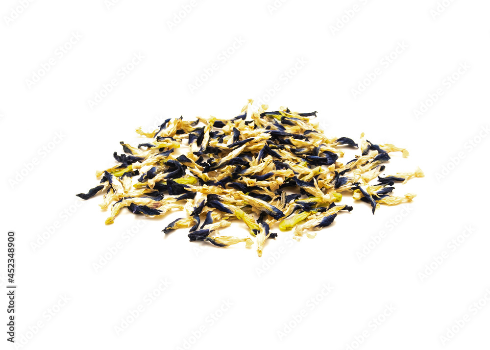 Organic pile of dried butterfly pea (Clitoria ternatea) flowers isolated on white