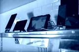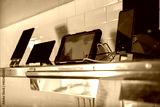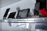 A view of several tablets used for food app deliveries, seen on a shelf in a restaurant kitchen.