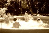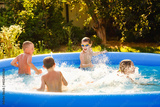 Summer season concept background. Four happy friends are having fun splashing in an inflatable pool in the garden, refreshing themselves in hot weather
