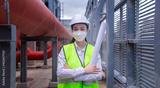 Engineer under checking the industry cooling tower air conditioner is water cooling tower air chiller HVAC of large industrial building to control air system ,wearing mask for protect pollution.