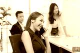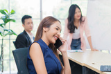 business woman sitting in meeting room at office talking on telephone and ignoring communication with each other for during work meeting