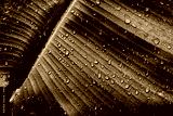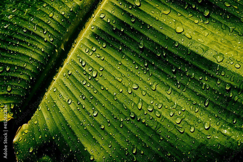 water drops on banana palm leaf, purity nature background