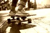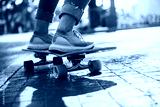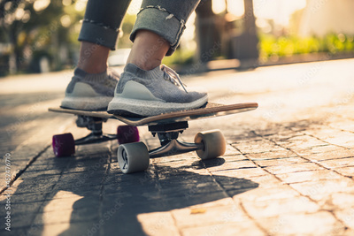 Close-up leg on surf skate or skateboard on the road, Sport activity lifestyle concept, Healthy and exercise.