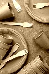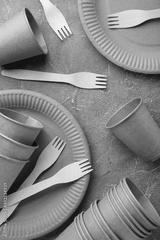 Eco friendly disposable tableware on a grey background. Vertical photo