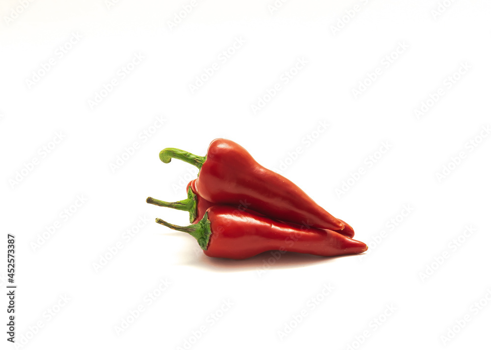 Three organic naturally ripen Fresno peppers or Fresno chili pepper isolated on white