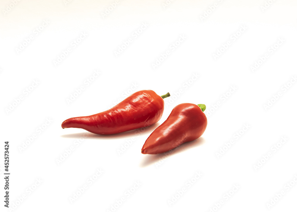 Two organic naturally ripen Fresno peppers or Fresno chili pepper isolated on white