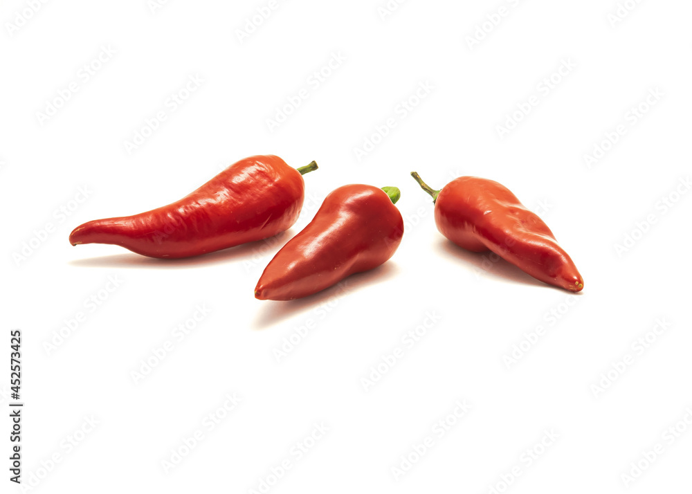 Three organic naturally ripen Fresno peppers or Fresno chili pepper isolated on white