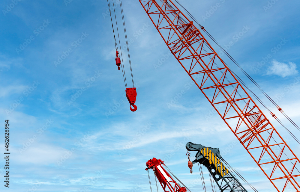 Crawler crane against blue sky and white clouds. Real estate industry. Red crawler crane use reel lift up equipment in construction site. Crane for rent. Crane dealership for construction business.