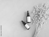 Two amber bottles with white labels and bouquet of dry oats on beige background.