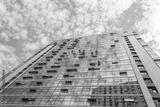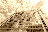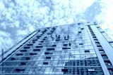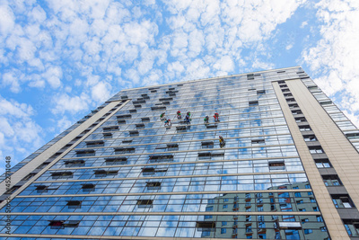 Climbers clean windows from the outside of the building washing the glazing of the facade of a multi-storey building.