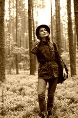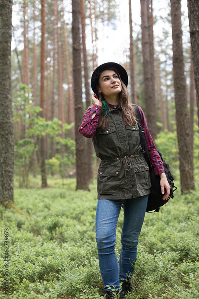 Young woman in a hat with her backpack walking while traveling in forest and exploring local nature