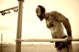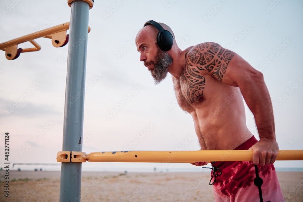 Athlete man practicing calisthenics while doing chin-ups at the beach.