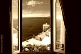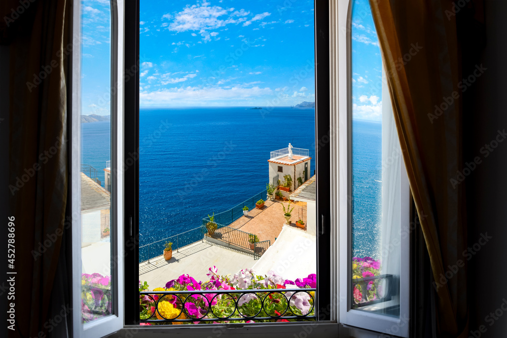 Scenic open window view of the Mediterranean Sea from a room along the Amalfi Coast near Sorrento, Italy