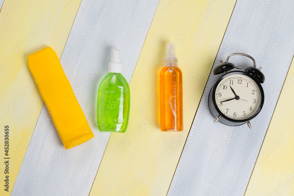 on a gray-yellow surface, a sun protection kit and an alarm clock