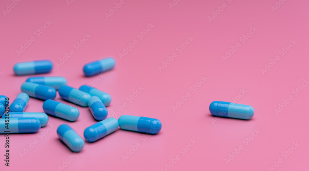 Blue antibiotic capsule pills on pink background. Online pharmacy banner. Group of antibiotic capsule pills. Pharmaceutical industry. Antibiotic drug resistance. Antimicrobial drug. Prescription drug.