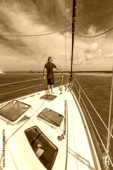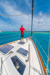 Man enjoying sailing trip on a luxury summer holiday vacation, sunny weather and ocean in background on a beautiful yacht