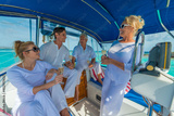 Senior and young couples, family, enjoying sailing trip on a luxury summer holiday vacation, sunny weather and ocean in background, love and romance on a beautiful yacht