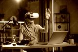 Modern smiling young Arab muslim woman in headscarf, using 3D augmented reality goggles at home in the evening, while working remotely on the project with imaginary screen, touching air
