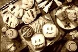 Halloween party food corner table scene over a wood background. Halloween party burger, mummies mini pizzas, halloween drink, Bell peppers with spaghetti and and minced tomato turkey.