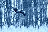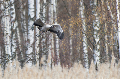 Common Crane (Eurasian crane) taking off in the forest behind the reeds in the beginning of May in Western Finland.