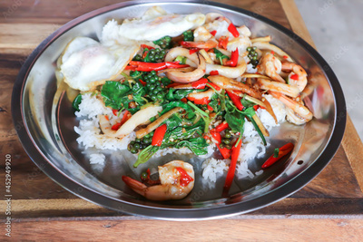 stir fried seafood with rice and fried egg, stir fried squid and shrimp