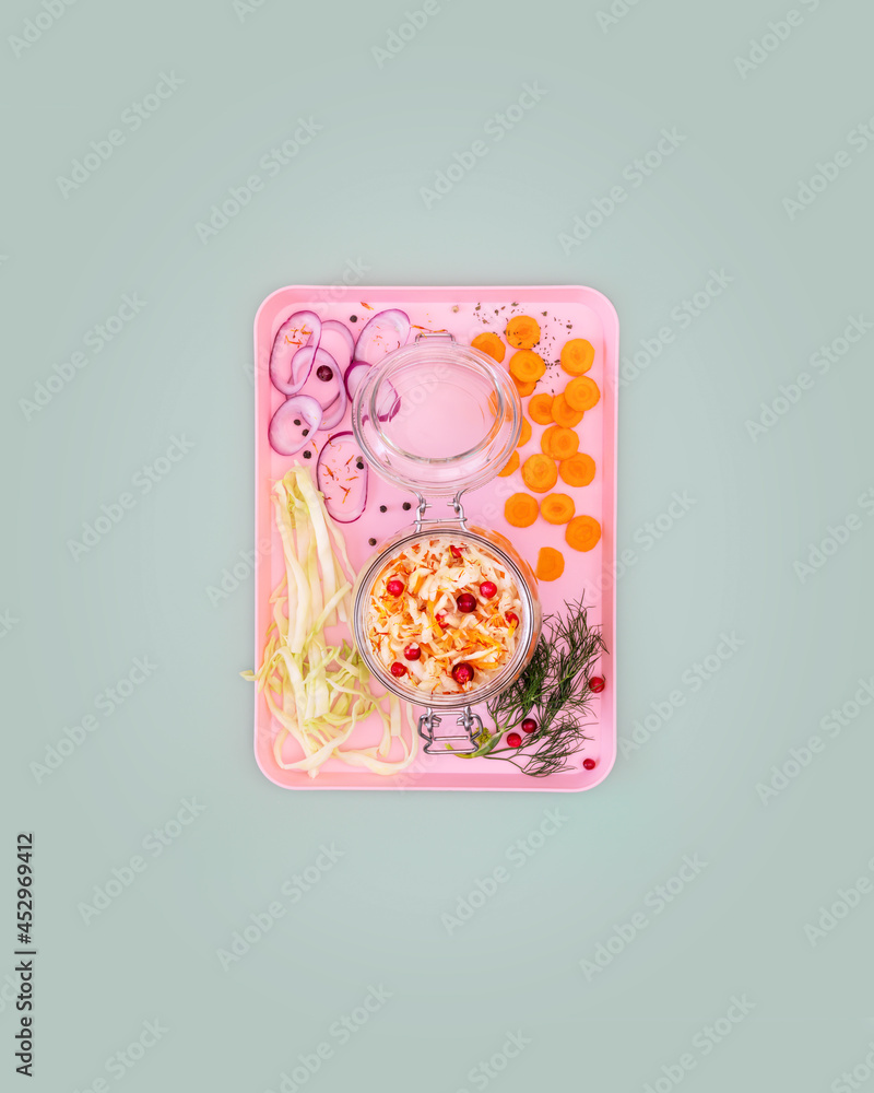 Fermented season cabbage with cranberries in a glass jar on a pink tray with natural vegetables and spices on a mint background. Hand made, immune boosting, vegan food. Preparation of sauerkraut
