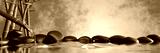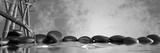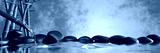 Clearwater flows out of bamboo sections. The shiny black stones overlap. The background is green and yellow waves like water waves. Spa style images. 3D Rendering