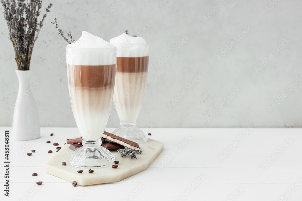 Glasses of tasty lavender latte, chocolate and flowers on light background