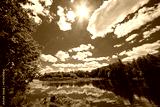 Summer landscape, nature in August, river, forest and beautiful clouds