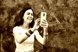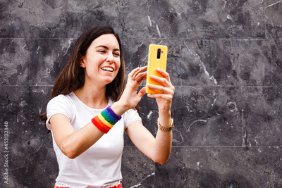 LGBT young white woman using smartphone on gray background. Gay lifestyle.