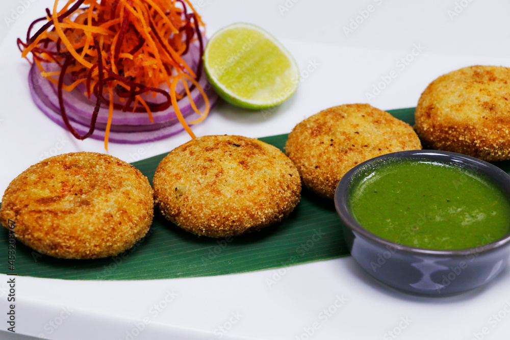 dahi kebab, deep fried spiced yoghurt patties rolled with semolina , indian street snack food