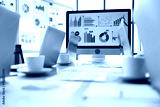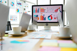 Laptop computer colorful post it paper report data graph chart documents placed on table in conference meeting room with analysis sales target on screen monitor and glass board in blurred background