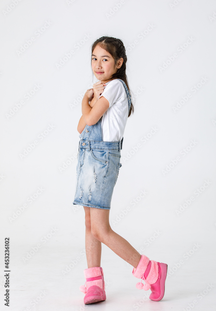 Portrait isolated studio shot of young long hair pretty cute girl in t shirt and denim skirt overalls with pink boots standing and posing with cheerful action in front of white background