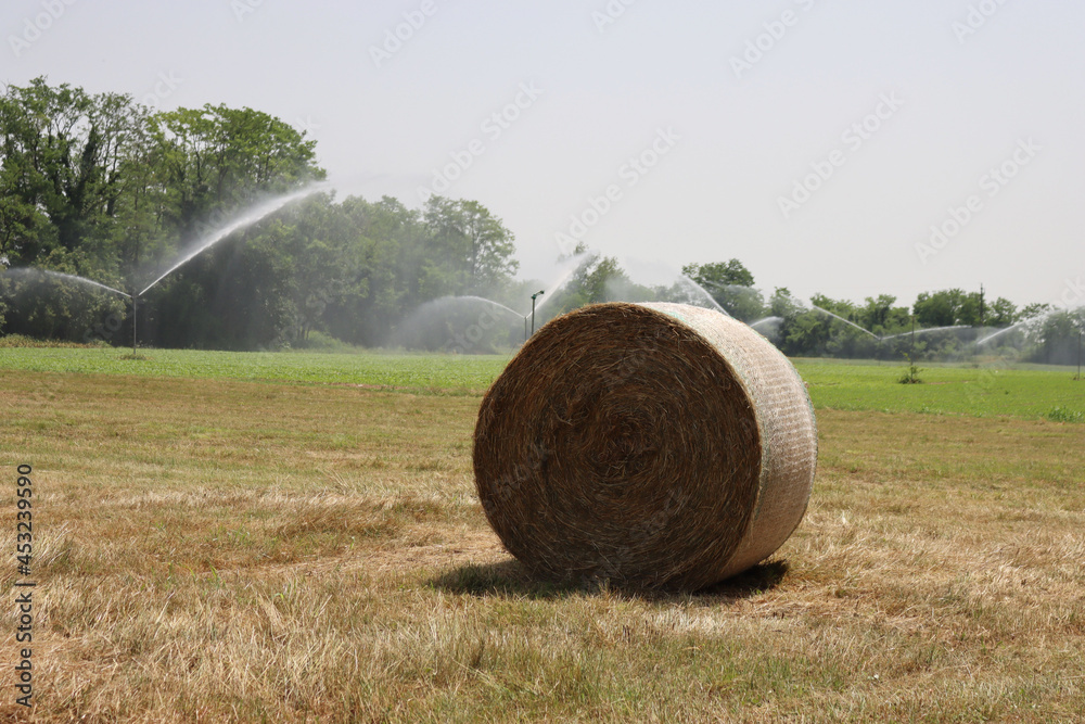 Dry hay bale on summer in the italian countryside. Meadow harvested for animal forage