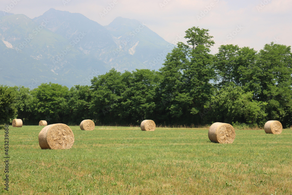 Dry hay bales on summer in the italian countryside. Meadow harvested for animal forage