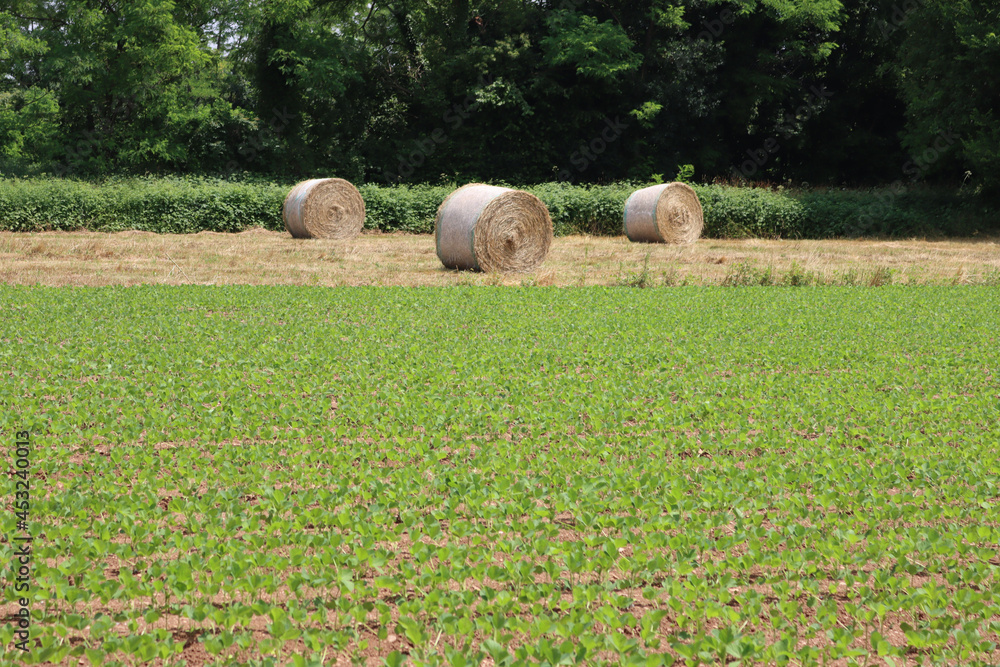 Dry hay bales on summer in the italian countryside. Meadow harvested for animal forage