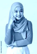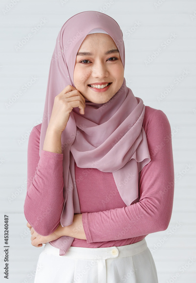 Portrait of a beautiful Muslim woman with a friendly and warm smile posing to the camera with self-confidence. She crossed her arms over chest