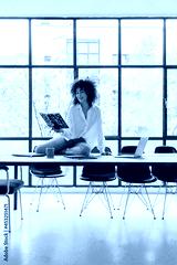 Young mixed race woman reading journal. Sitting on desk. Carefree and happy student. Messy desktop.
