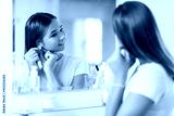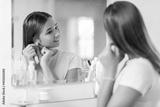 beauty, hygiene and people concept - teenage girl with diamond earring looking in mirror at bathroom