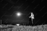Couple looking at the full moon while standing by the cliff of the sea