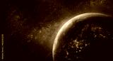 Earth planet in deep space. Outer dark space wallpaper. Night on planet with cities lights. Surface of Earth. Sphere. View from orbit. Elements of this image furnished by NASA