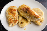 Browned Breaded Chicken Cutlets on a White Plate: Thinly cut chicken breasts that have been pan-fried on a plate