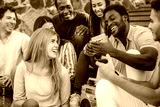 Young diverse people having fun listening music with boombox stereo outdoor in the city - Focus on african man holding cassette