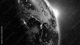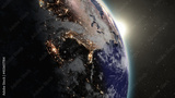 3d rendering of night to day planet earth sunrise view from space with sun showing up from the east spreading daylight over North America in universe cosmos science concept